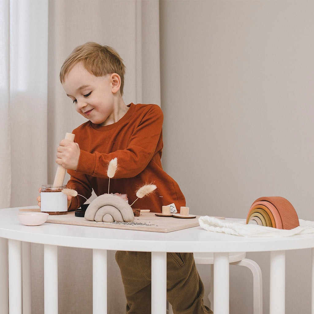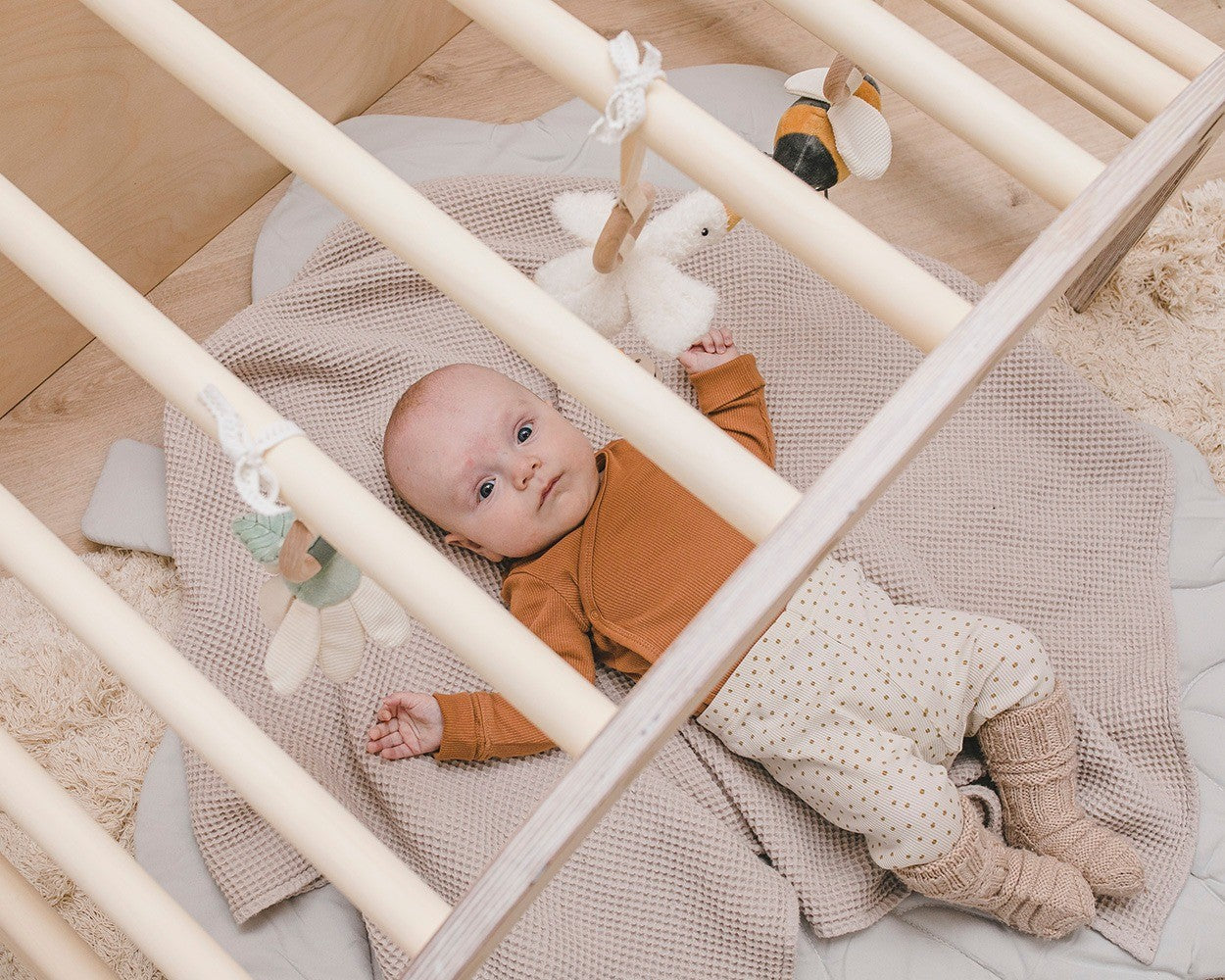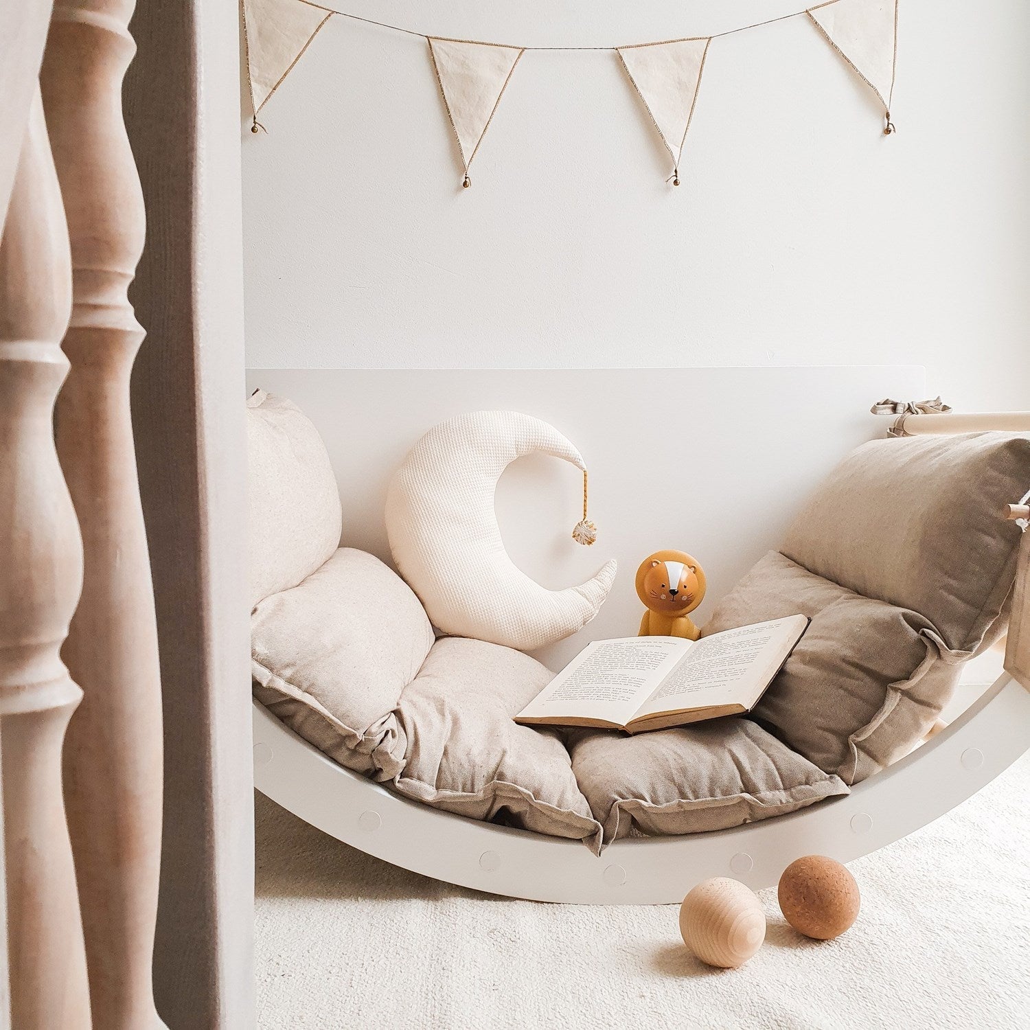 Umgedreht verwandelt sich der Montessori-Bogen in einen Schaukelstuhl – perfekt für kleine Piraten oder als gemütliches Nest für ein Nickerchen am Nachmittag. Für diese Verwendung empfehlen wir das Kaura-Kissen, das die Nutzung des Bogens als Schaukelstuhl sicherer und bequemer macht.