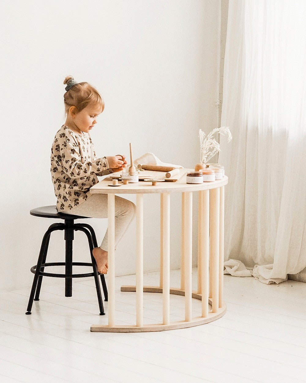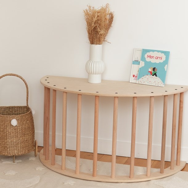 Legt man den Bogen auf die Seite, sodass die Platte nach unten zeigt, und schiebt ihn an eine Wand, wird er zu einem Spielzeugaufbewahrungsmöbel. Ideal für große Kuscheltiere oder Kissen und Decken!